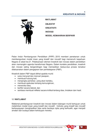 31 Sensitifitas terhadap masalah. Kurikulum ini tentu belum ada ketika Indonesia merdeka pada tahun 1945. Pelaksanaan elemen kreativiti dan inovasi dalam pendidikan akan memangkin agenda transformasi Negara.